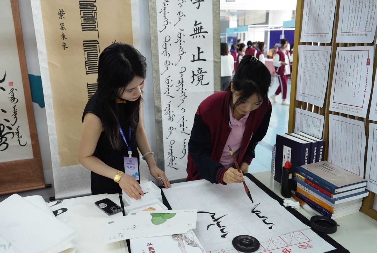 展会现场,为使“满语文”非遗展效果更佳,该项目代表性传承人刘厚生教授展示了教研新成果——满汉文读写卡片。女真文、满文多种书法作品深受参观者喜爱。我校满语文专业师生吕萍、张楚南、葛晓妍、关晟龙进行活态传承,通过现场书写满文条幅及图书签名,手把手教写满文,展示了濒危文字的魅力,科普了满族文化。本次参展首届东北图书博览会,体现了我校“满语文”特色学科建设,是对非物质文化遗产保护传承的又一成果。