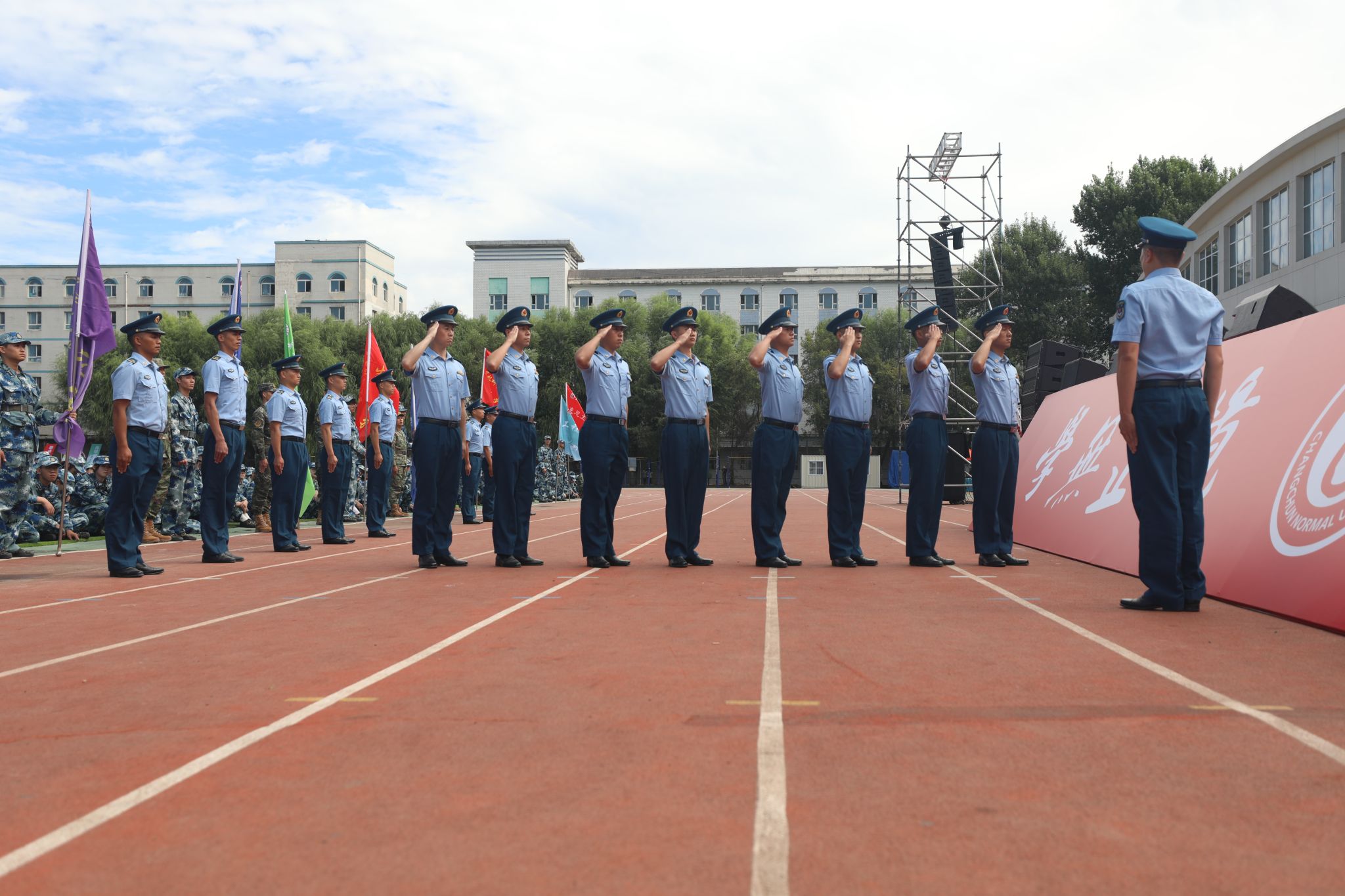 学校党委学生工作部、党委武装部、校团委等相关人员,全体带训辅导员、军训教官及2024级参训学生参加开训仪式。